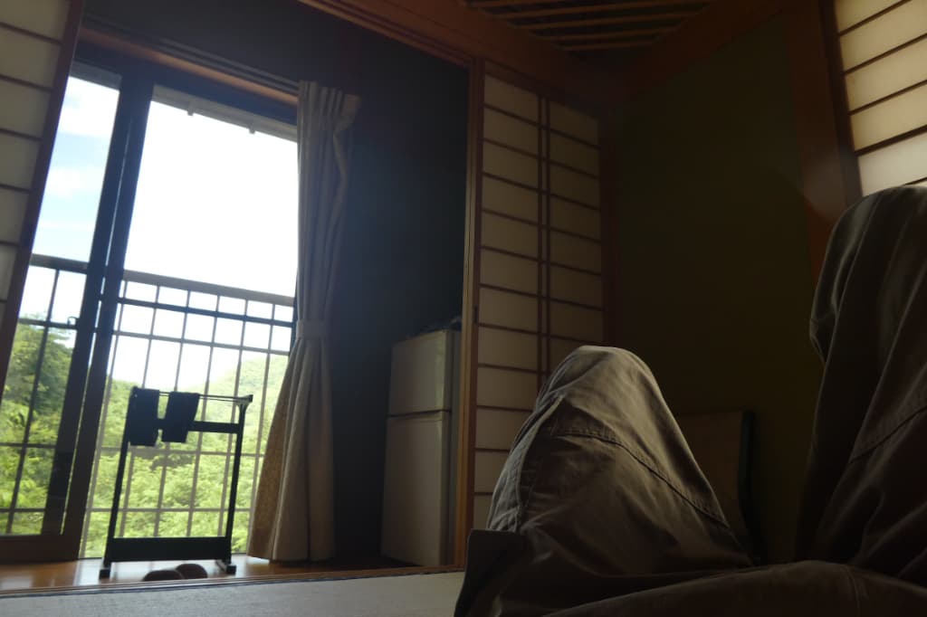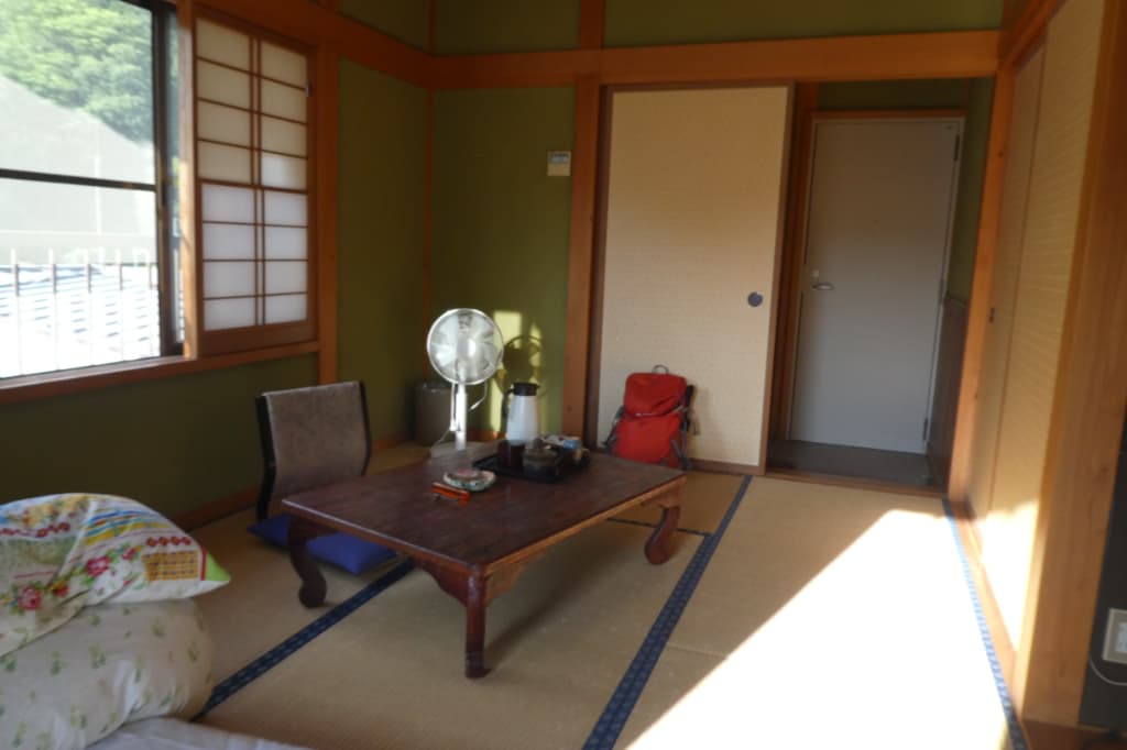 差し込む日差し、清潔な部屋、既に敷いてある布団、そして緑いっぱいの眺め!サイズも一人で過ごすにはちょうどいい広さだ。